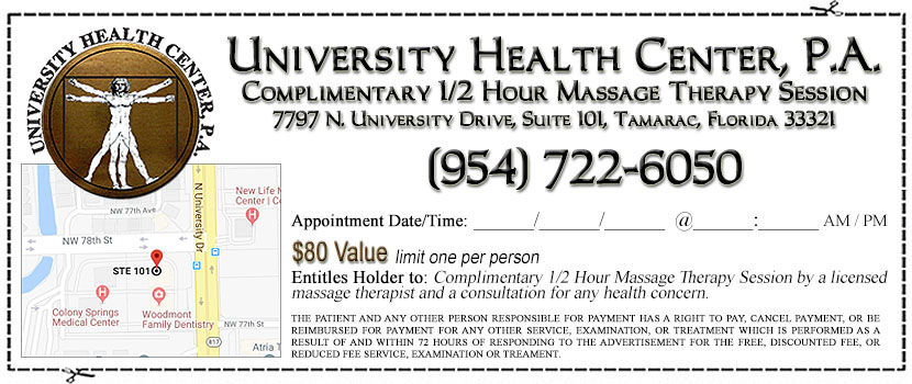 University Health Center ("UHC") office located in Tamarac, Florida provides top-quality chiropractic care, physical therapy, and massage therapy. Our Tamarac location has even been around since 1989! Our Health Care Center also houses its own digital x-ray facilities. Our professional staff can increase your "Quality Of Life" by applying years of experience with the latest techniques in chiropractic care.